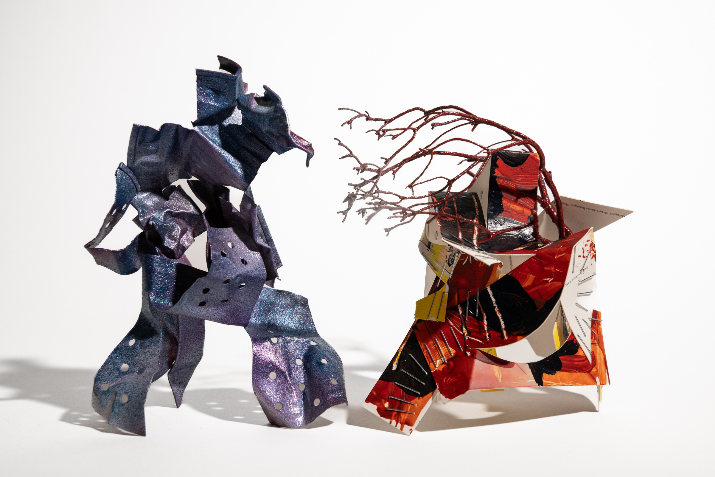 This exhibition celebrates the power of play — not as escape, but as liberation. The selected sculptures emerge from consistent, daily practice. Using materials at hand, these ephemeral constructions of plastic, cardboard, metal, and paint resist pretension, perfection, and preciousness. Each piece bears the imprint of the hand. Textures are rough-hewn, the scale intimate, the feeling expansive — even sacred. Through photography and altered perceptions of scale, the sculptures are transfigured: the small becomes monumental, abstraction crystallizes into metaphor, warrior-like figures arise, and casual constructions transform into symbols of power, survival, and strength.