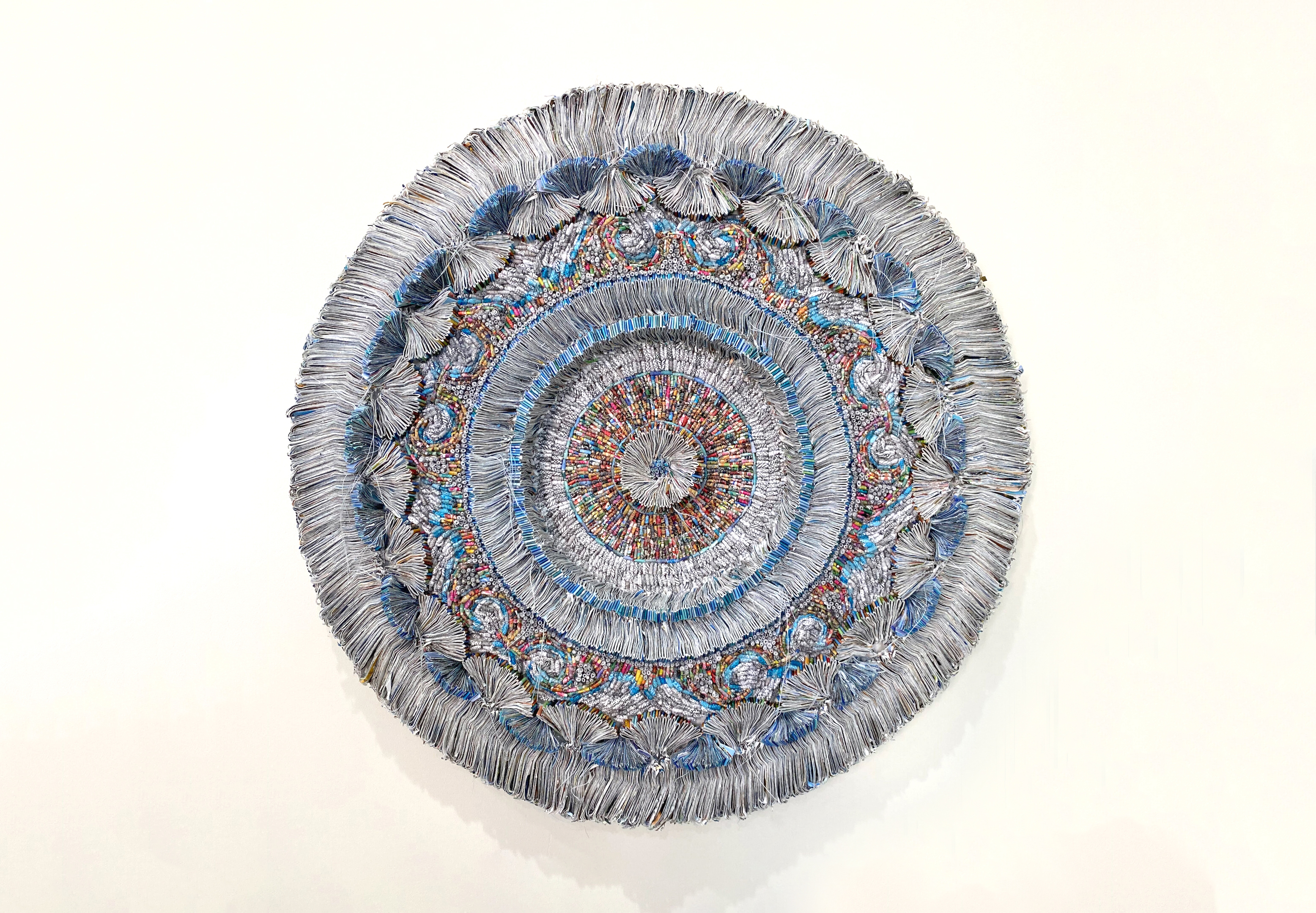 “My work dismantles and transforms images, words, and printed patterns from mass marketing catalogs, magazines, and security envelopes. Shredding these materials breaks down their physical and ascribe composition, allowing me to re-contextualize their original messages into personal, domestic, and cultural narratives.”