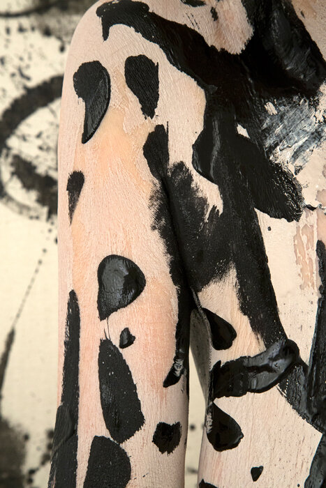 Painting her own body and performing for the camera builds on the logic of action painting. It also makes literal the notion of presence in the marks. What emerges is a paradox of the art-making process, where you’re subject and object, but it’s not about you. Rather, it’s a process of finding and losing. Presence implies absence. You’re there but not there.